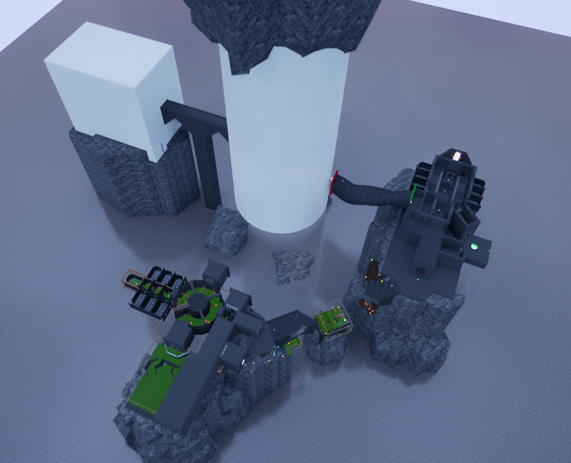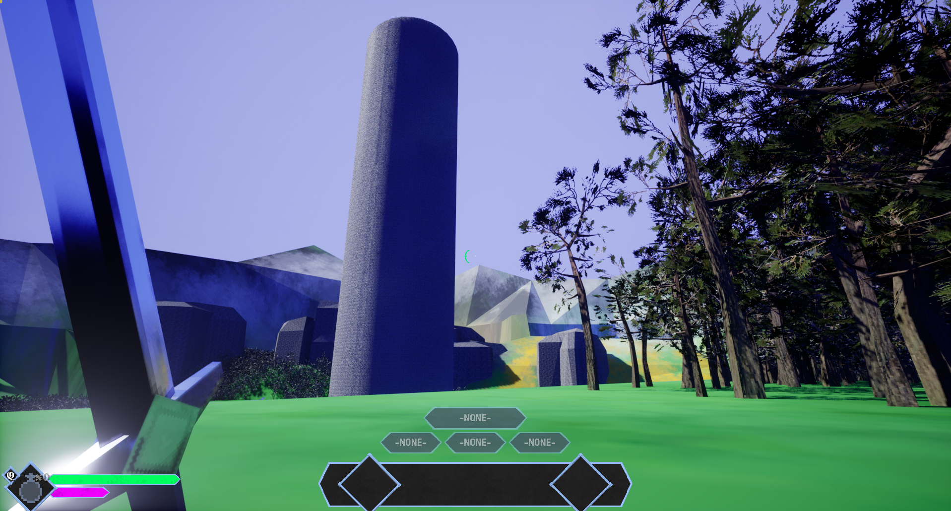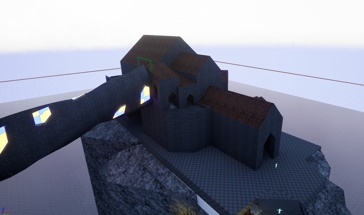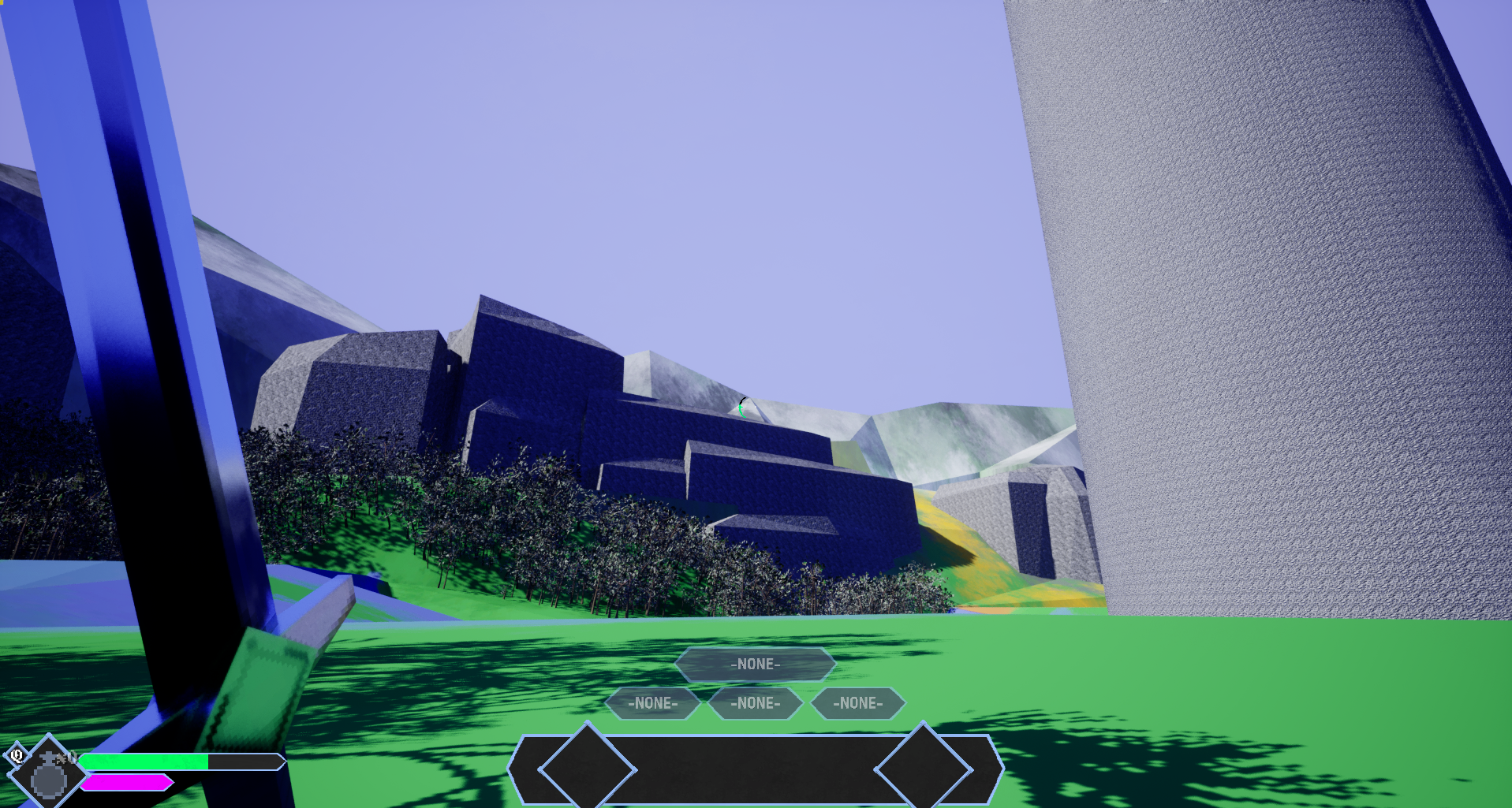 This model was then imported into unreal to better understand how large the world should be. To assist in the sizing, some assets such as large cliffs and regular trees, were placed around to give a better idea of the distance to all things in the world. You can see the images below: